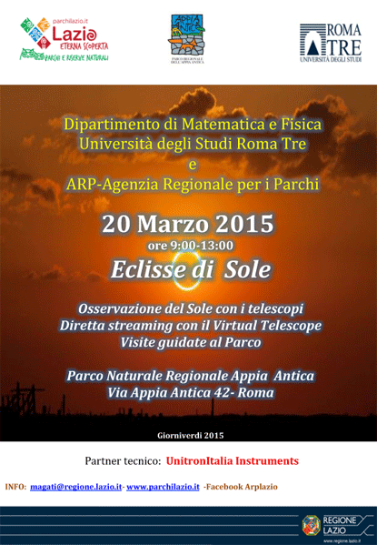 Il 20 Marzo tutti a seguire l'Eclisse di Sole. L'Agenzia Regionale per i Parchi, il Dipartimento di Matematica e Fisica dell'Università Roma Tre e il Parco dell'Appia Antica organizzano una mattinata ad osservare questo particolare e unico fenomeno. Saranno a disposizione di tutti gli appassionati telescopi e strumentazioni tecniche per osservare l'Eclissi di Sole. A seguire visite guidate al Parco. Appuntamento alle ore 9:00 al Parco dell'Appia Antica in via Appia Antica 42.