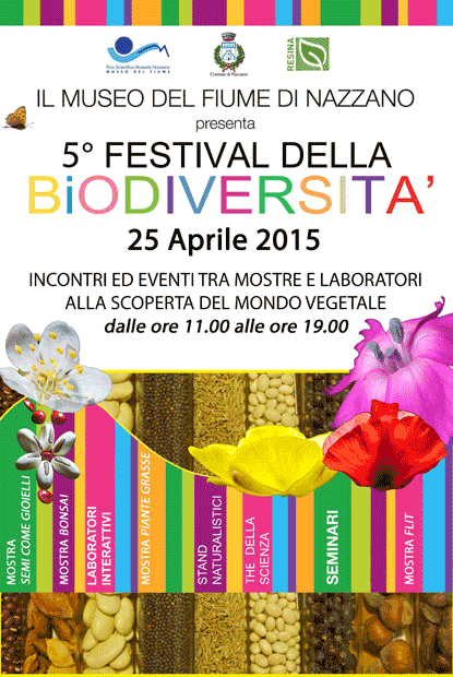 Il 24 aprile Nazzano (Rm), dalle 10,00 alle 18,00, ospita il Convegno "Ecologia applicata nelle Aree Protette" a cui parteciperanno per l'ARP Giuliano Tallone, Andrea Monaco e il Direttore Vito Consoli. Il convegno, organizzato dal Museo Del Fiume, si svolge all'Interno del Festival della Biodiversità, giunto alla V edizione. Dunque, anche quest'anno, nei giorni 24 e 25 aprile, scienziati, naturalisti, scrittori e appassionati di natura si incontreranno per "raccontare la biodiversità" nella cornice della Riserva di Nazzano, Tevere Farfa . Il programma prevede eventi, mostre, mercatini, laboratori didattici e caffè scientifici. Tema del 2015 é: "Il mondo vegetale".
