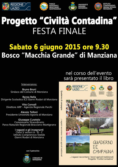 Sabato 6 giugno 2015 presso il Bosco Macchia Grande di Manziana si terrà la festa finale del progetto Gens 2.0 "La civiltà contadina". Durante l'evento sarà presentato il libro "Quaderno di Campagna" dove i ragazzi dell'Istituto Comprensivo Statale Gianni Rodari di Manziana raccontano i lavori agricoli tradizionali. All'evento interverrà il Direttore dell'Agenzia Regionale per i Parchi Vito Consoli.