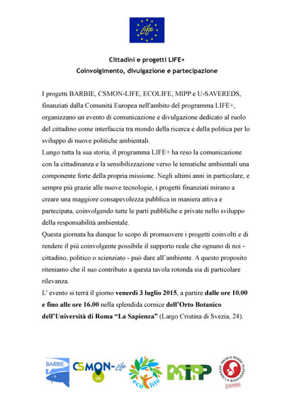 Venerdì 3 luglio 2015, dalle ore 10.00 alle ore 16.00, presso l'Orto Botanico dell'Università di Roma "La Sapienza" (Largo Cristina di Svezia, 24). si terrà l'evento "LIFe+. Coinvolgimento, divulgazione e partecipazione." L'evento è dedicato al ruolo del cittadino come interfaccia tra mondo della ricerca e della politica per lo sviluppo di nuove politiche ambientali.Il programma LIFE+ ha reso la comunicazione con la cittadinanza e la sensibilizzazione verso le tematiche ambientali una componente forte della propria missione. Questa giornata ha lo scopo di promuovere i progetti coinvolti e di rendere il più coinvolgente possibile il supporto reale che ognuno di noi, cittadino, politico o scienziato, può dare all'ambiente.
