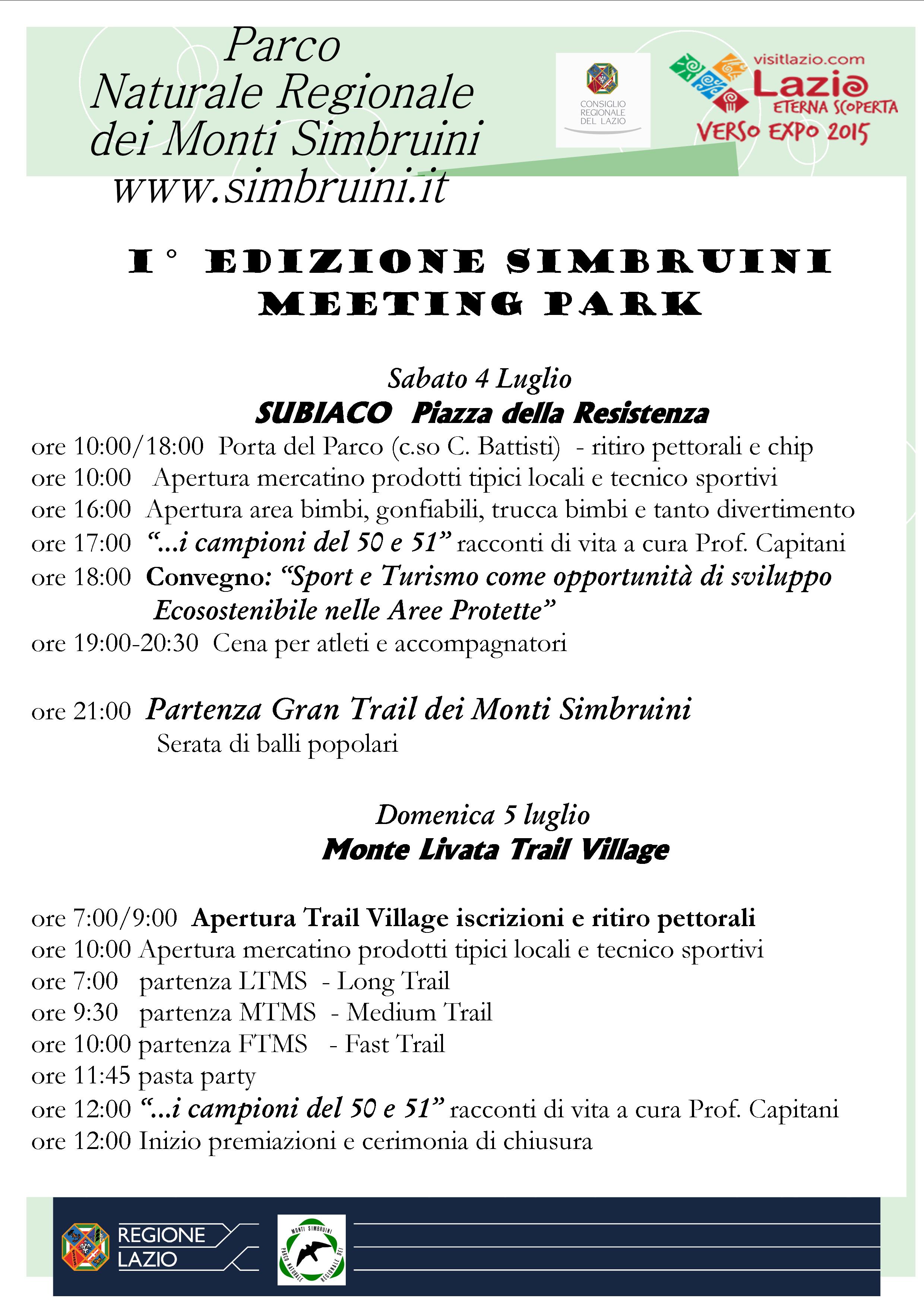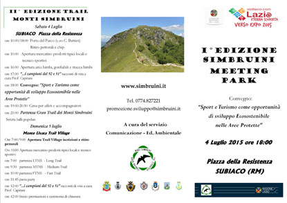 Sabato 4 luglio luglio, in Piazza della Resistenza a Subiaco (Rm), alle ore 18:00, in occasione della “ Prima Edizione del Simbruini Meeting Park” si terrà il convegno su: “Sport e Turismo come opportunità di sviluppo ecosostenibile nelle Aree Protette” a cui parteciperà Vito Consoli, direttore dell'Agenzia Regionale per i Parchi.
