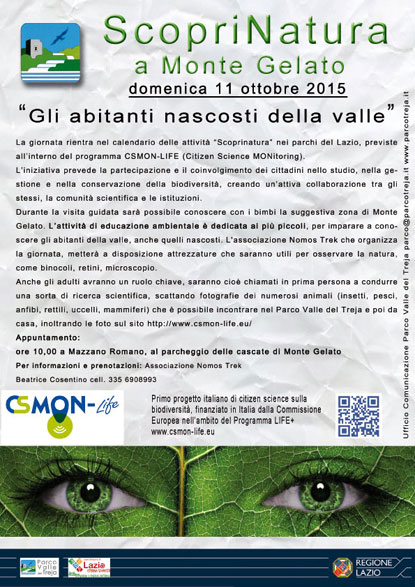 Continuano le attività SCOPRINATURA nel Lazio, attività previste all'interno del programma CSMON-LIFE (Citizen Sience Monitoring). CSMON - LIFE è il primo progetto italiano di citizen science sulla biodiversità, finanziato in italia dalla Commissione Europea nell'ambito del programma Life+. L'iniziativa prevede la partecipazione ed il coinvolgimento dei cittadini nello studio, nella gestione e nella conservazione della biodiversità, creando un attiva collaborazione con la comunità scientifica e le istituzioni. La giornata è dedicata alla conoscenza degli abitante del Parco Naturale Valle del Treja Appuntamento domenica 11 ottobre alle ore 10.00 a Mazzano Romano al parcheggio delle cascate di Monte Gelato.