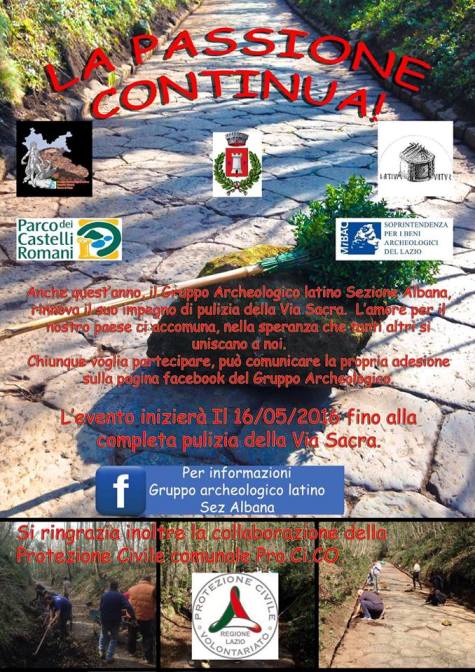 Il 16 maggio p.v, inizierà il nuovo intervento di bonifica della Via Sacra presso il comune di Rocca di Papa (RM), a cura del Gruppo Archeologico Latino Sezione Albana di Rocca di Papa. L’iniziativa, giunta quest’anno alla III edizione, vedrà impegnati i volontari del GALsull’antico basolato che porta verso Monte Cavo, il Mons Albanus oggetto di venerazione dalle antiche popolazioni latine. Il Parco regionale dei Castelli Romani ha patrocinato l’iniziativa, autorizzata dalla Soprintendenza dei Beni Archeologici del Lazio e dell’Etruria Meridionale. Durante le operazioni di pulizia il tracciato sarà visitato dagli studenti delle scuole elementari e medie, dal 23 al 29 maggio inoltre si svolgeranno le “Feriae Latinae”, la caratteristica manifestazione che riproduce la scalata in costumi d’epoca, a quello che era il tempio di Giove Latino, oggetto di culto delle antiche popolazioni del Lazio, dove si celebravano i sacri riti che culminavano con il sacrificio e la consumazione di un toro bianco.