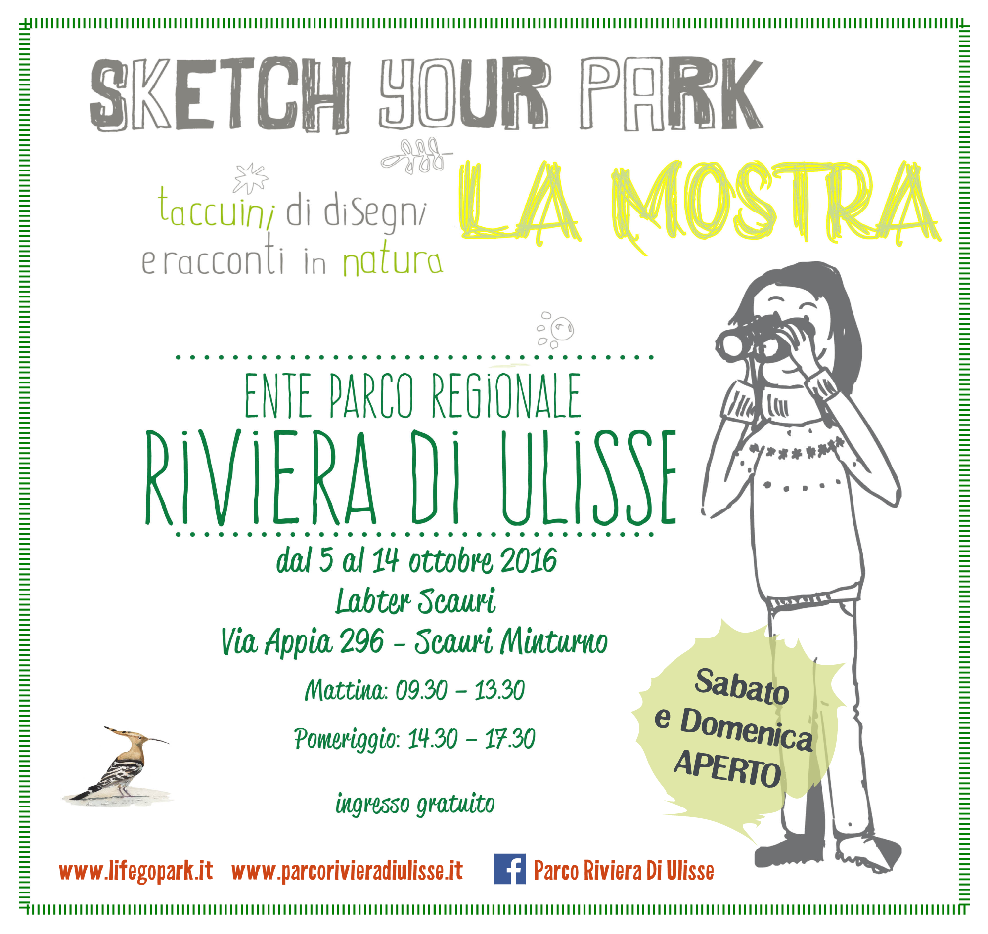 Dal 5 al 14 Ottobre 2016, presso il Labter Scauri - Via Appia 296, Scauri Minturno - sarà possibile ammirare e sfogliare i taccuini di disegno naturalistico realizzati dalle classi delle scuole di Gaeta, Formia e Minturno che hanno partecipato al concorso "Sketch Your Park". Tra questi vi è quello intitolato “Alla ricerca degli animali mattinieri e nottambuli”, un taccuino a soffietto con doppio verso di lettura, realizzato con pastelli e collage, che per la sua bellezza e particolarità è stato premiato tra le 9 opere vincitrici. Altre invece, per la loro accuratezza naturalistica, hanno ricevuto dalla giuria delle menzioni speciali.