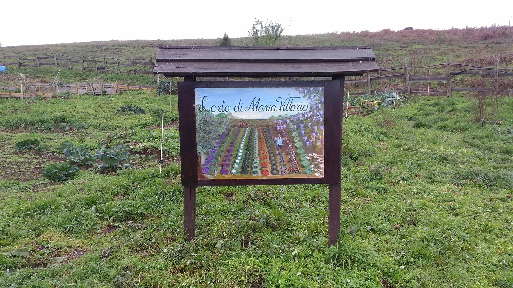 L’orto di Maria Vittoria saluta i suoi visitatori con una colorata insegna realizzata dall’artista Liesbeth Veltkamp e, in Primavera, si arricchirà di tante bontà della Terra, seminate e curate dalle mani esperte degli ospiti e dei gestori della Collina.