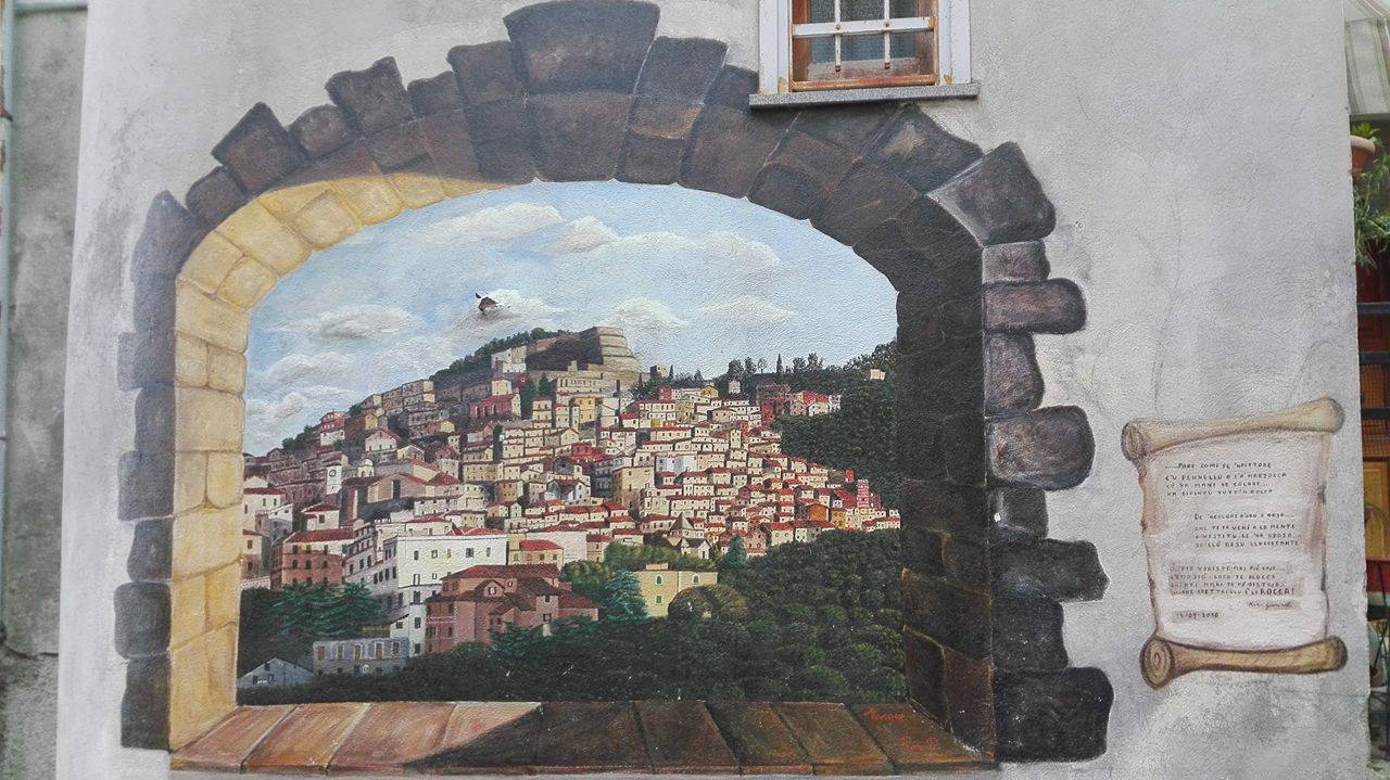 Le parole dell’artista Mario Giovannetti, impresse su un muro a Rocca di Papa (RM), anticipano ciò che la città svela a coloro che si addentrano lungo i vicoli: murales che abbelliscono e ravvivano le mura degli edifici.