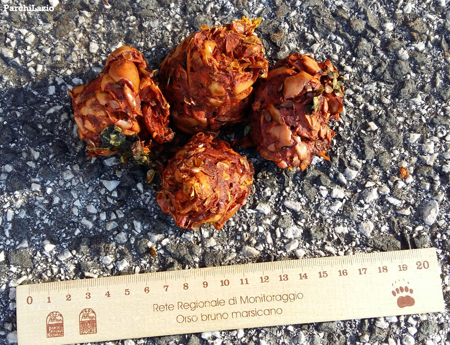 Gli escrementi dell’orso hanno la particolarissima caratteristica di essere profumati, per esempio quando contengono i resti di un pasto a base di rosa canina, come nel caso della foto.