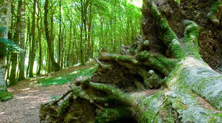 Volgiamoci a sud. Basta una breve passeggiata, da qui, per raggiungere a piedi la vetta ammantata dal bosco del monte Cimino. Si tratta di un vero e proprio vulcano che vanta due record: è il vulcano più antico del Lazio continentale (battuto soltanto dall'isola di Ponza) ed è anche il più alto, superando i 1000 m di quota. Il vulcano Cimino conclude la sua attività circa 90.000 anni fa, con una fase effusiva che ha determinato la fuoriscita di colate successive di lava. Passeggiando nella faggeta (vedi: faggio ), le rocce che incontrerete sono costituite proprio da blocchi di questa antica lava. Tracce del Lazio di ieri.