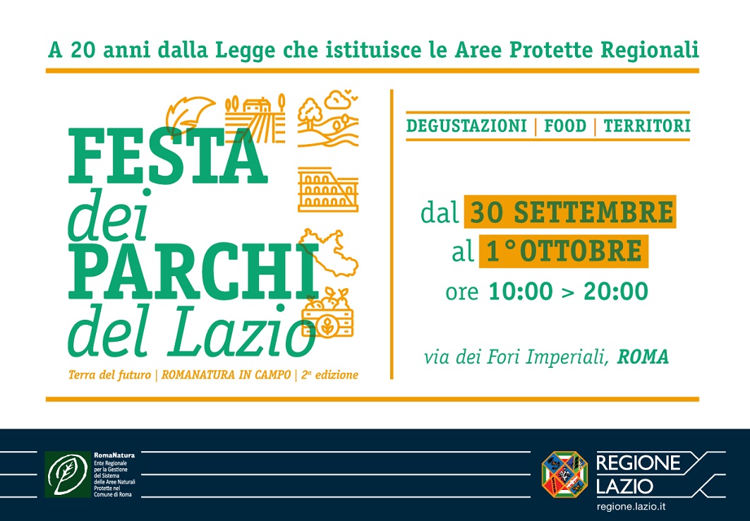 Sabato 30 settembre e domenica 1° ottobre, a via dei Fori Imperiali a Roma, si terrà la seconda edizione della "Festa dei Parchi del Lazio - Terra del futuro" organizzata dall'ente RomaNatura e dall'Assessorato Rapporti con il Consiglio, Ambiente e Rifiuti della Regione Lazio.