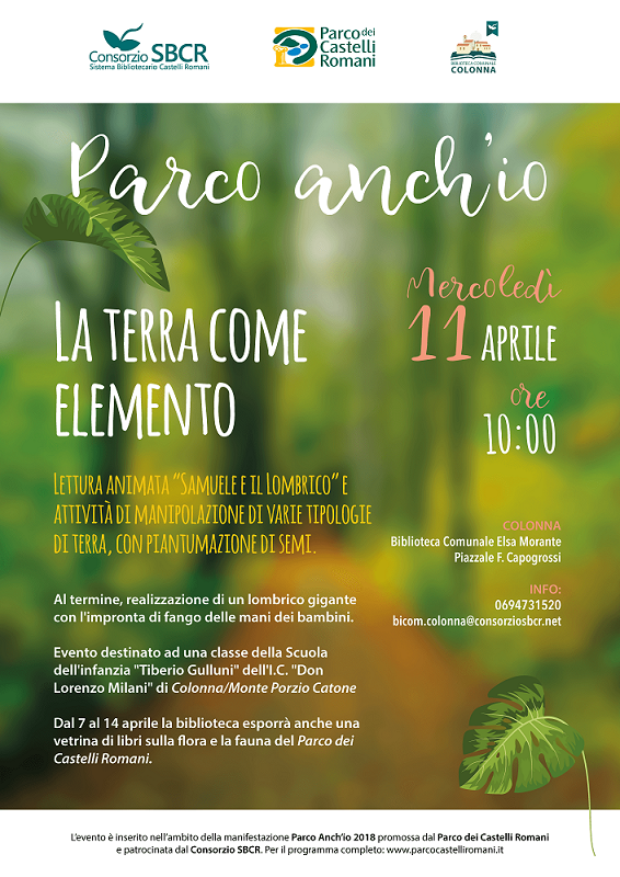 Anche al di fuori dei confini del Parco dei Castelli Romani si celebra “Parco anch’io”. La biblioteca “Elsa Morante” di Colonna il prossimo 11 aprile dedica una mattinata a letture ed attività ludiche con i bambini della Scuola dell’Infanzia “Tiberio Gulluni” e dell’I.C. Don Milani di Monte Porzio Catone. Inoltre, dal 7 al 14 ci sarà all’interno della biblioteca, come in tutte le altre biblioteche dei Castelli Romani, una vetrina con libri relativi alla fauna e alla flora del Parco.