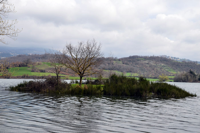 La tipica vegetazione palustre caratterizzata da giunchi, cannucce, ranuncoli acquatici ecc, non si sviluppa lungo le coste del lago ma a ridosso dei vari fossi naturali che convogliano le acque meteoriche (il Fosso del Diluvio, il fosso Dove, il fosso Padrone e il fosso Riopreta). Nella zona orientale del lago, a poca distanza dalle sponde, sono presenti estesi campi ad uso agricolo e per il pascolo. Le forme arboree iniziano a svilupparsi dal limite di massimo invaso delle acque (550 m s.l.m.); più a valle si trovano latifoglie igrofile come salici (Salix alba e Salix fragilis) e pioppi (Populus alba e Populus nigra). Salendo di quota invece specie tipiche dell’Appennino, caratterizzate da formazioni boschive di querce rappresentate essenzialmente dal cerro (Quercus cerris) e da boschi misti di latifoglie come il carpino nero (Ostrya carpinifolia), la roverella (Quercus pubescens), l’acero campestre (Acer campestre) e l’orniello (Fraxinus ornus).