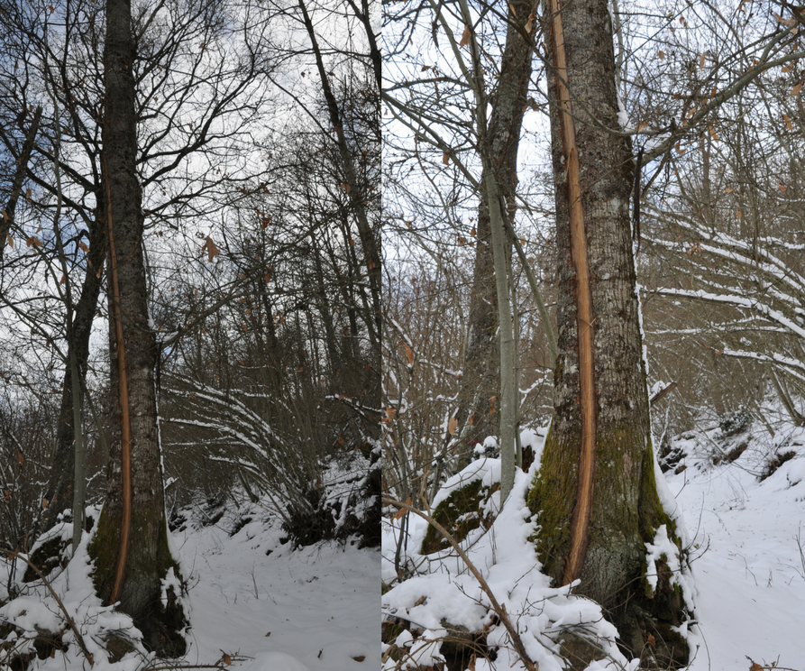 Gli effetti più evidenti dell’onda d’urto del fulmine provocano l’apertura di spaccature lungo la corteccia, le fessure superficiali che si notano sulla parte esterna del legno. Il danno può interessare tronco e rami fino ad arrivare alle radici. L’onda d’urto energetica, produce una forte compressione sulla corteccia e sul legno, lacera i tessuti dapprima comprimendo e poi spingendo verso l’esterno, andando a colpire le parti più vecchie e deboli, innescando in questo modo una forza esplosiva.