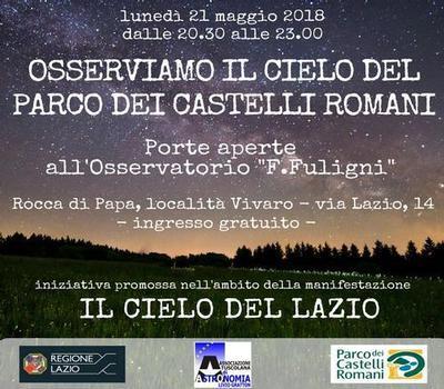 Lunedì 21 maggio 2018, dalle 20.30 alle 23.00, una serata da non perdere presso l'Osservatorio "F.Fuligni" - località Vivaro - Rocca di Papa (RM). "Osserviamo il cielo del Parco dei Castelli Romani", un incontro per scoprire i segreti del cielo notturno ad occhio nudo e con il telescopio, sotto la guida degli esperti dell'Associazione. L'iniziativa è gratuita e promossa nell'ambito della manifestazione: "Il Cielo del Lazio".