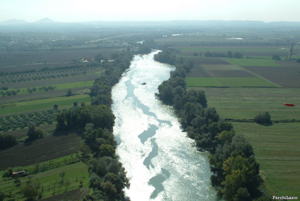 Il fiume Tevere poco a nord di Castel Giubileo, appena fuori da Raccordo Anulare, scorre tra gli alberi in mezzo alla campagna coltivata. Foto di Paolo Gherardi