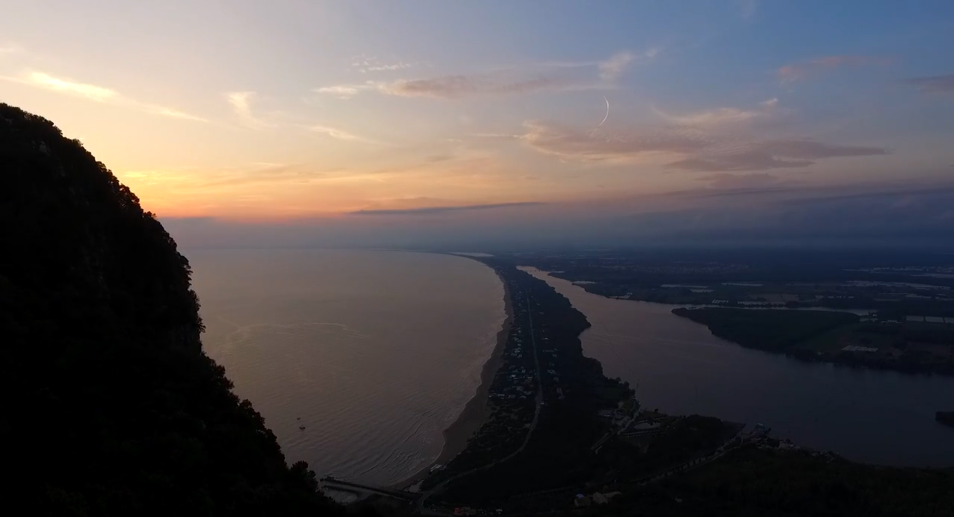 Il promontorio del Circeo, alto sul mare, domina la costa, la pianura e i laghi retrodunali. Oltre la duna c'è il lago di Sabaudia.