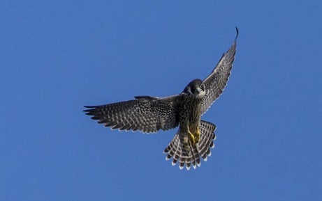Il Falco pellegrino (Falco peregrinus), è un rapace diurno della famiglia dei Falconidi, si narra che il nome derivi dal piumaggio sul capo, che ricorda un copricapo scuro molto simile ai cappucci che, nel Medioevo, indossavano i pellegrini mentre compivano i cammini di devozione. Ha una apertura alare di circa un metro; è un abile predatore oltre ad essere il più veloce uccello al mondo in grado di raggiungere circa 300 km/h in picchiata. Molto legato alle pareti rocciose (sulle quali nidifica), si nutre di uccelli catturati in volo, tra le sue prede preferite alcune specie come i piccioni, per questo il Falco pellegrino è anche considerato fondamentale per il mantenimento della biodiversità esercitando un’efficacie azione di predazione e, quindi, evitando gli squilibri dovuti alla mancanza di uno degli anelli della catena alimentare.