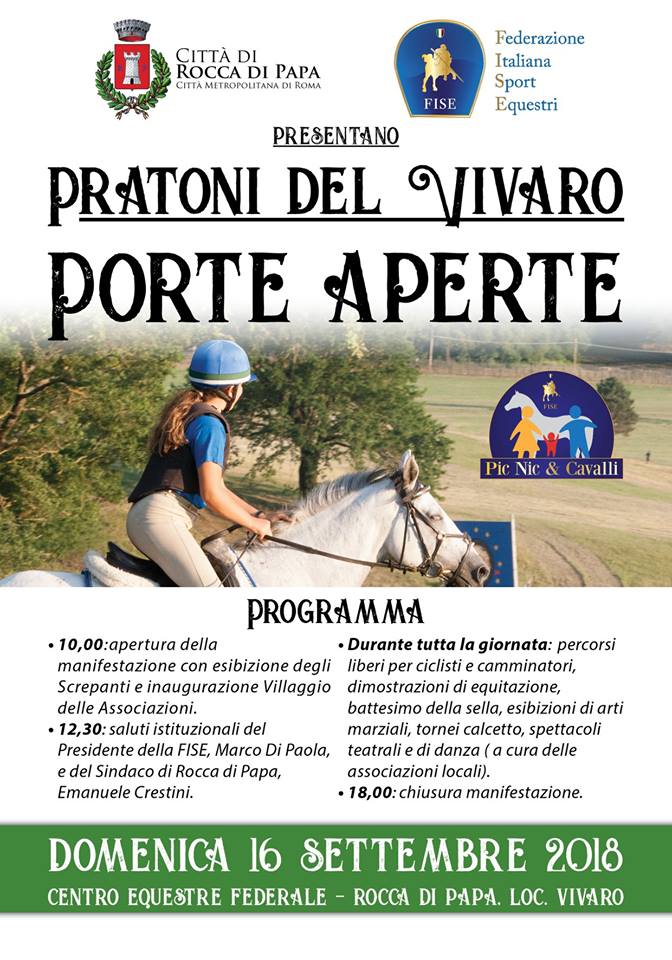 Domenica 16 settembre 2018 si terrà la manifestazione “Pratoni del Vivaro – Porte Aperte”, organizzata dal Comune di Rocca di Papa e dalla Federazione Italiana Sport Equestri (FISE), nella quale la Federazione e le associazioni locali avranno modo di presentarsi, ognuna dando vita a differenti iniziative aperte al pubblico, come dimostrazioni equestri, battesimi della sella, percorsi per ciclisti e camminatori, esibizioni di arti marziali, spettacoli musicali, teatrali e di danza.