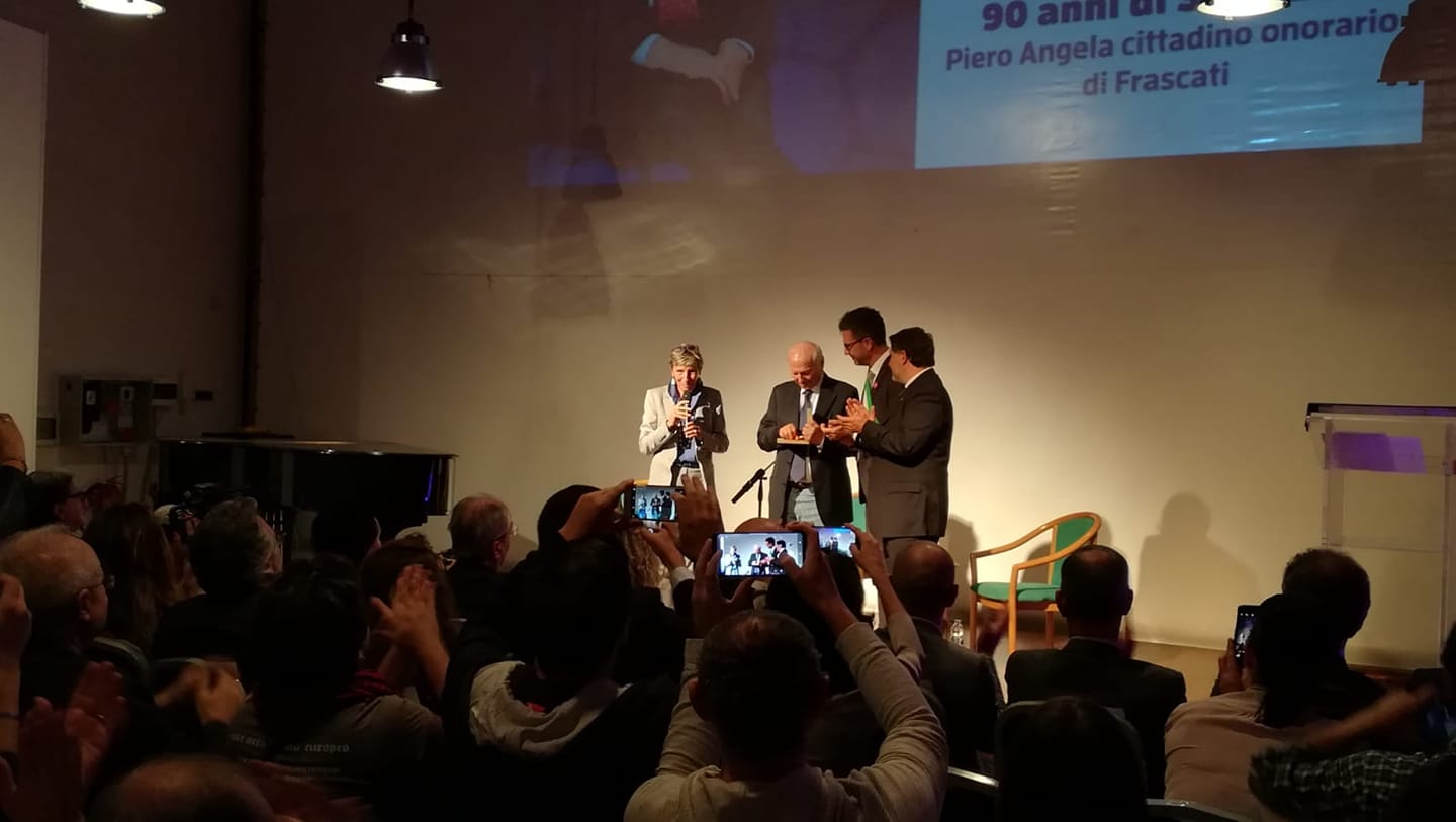 Insignito della Cittadinanza onoraria Piero Angela con una cerimonia ufficiale alle Scuderie Aldobrandini, affollate da un pubblico di curiosi e appassionati del celebre divulgatore scientifico.
