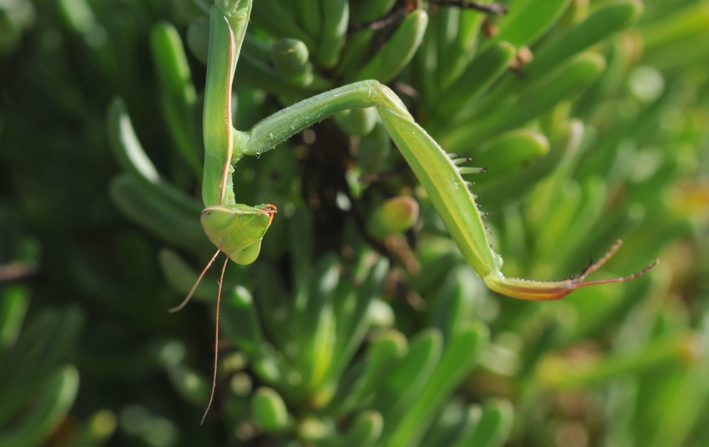 Questo bellissimo esemplare di Mantide religiosa (da “mantis", cioè profeta, indovino per la posizione che assumono con le zampe anteriori) era nascosto tra le foglie di Enula bacicci, pianta alofila tipica dei litorali sabbiosi e rocciosi e prati retrodunali salmastri periodicamente inondati.