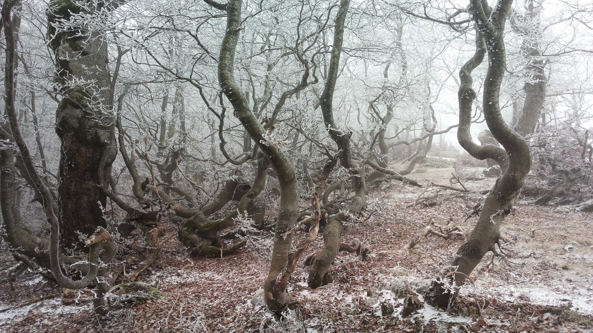 Nella foto un bosco avvolto nella galaverna, nel Parco dei monti Simbruini