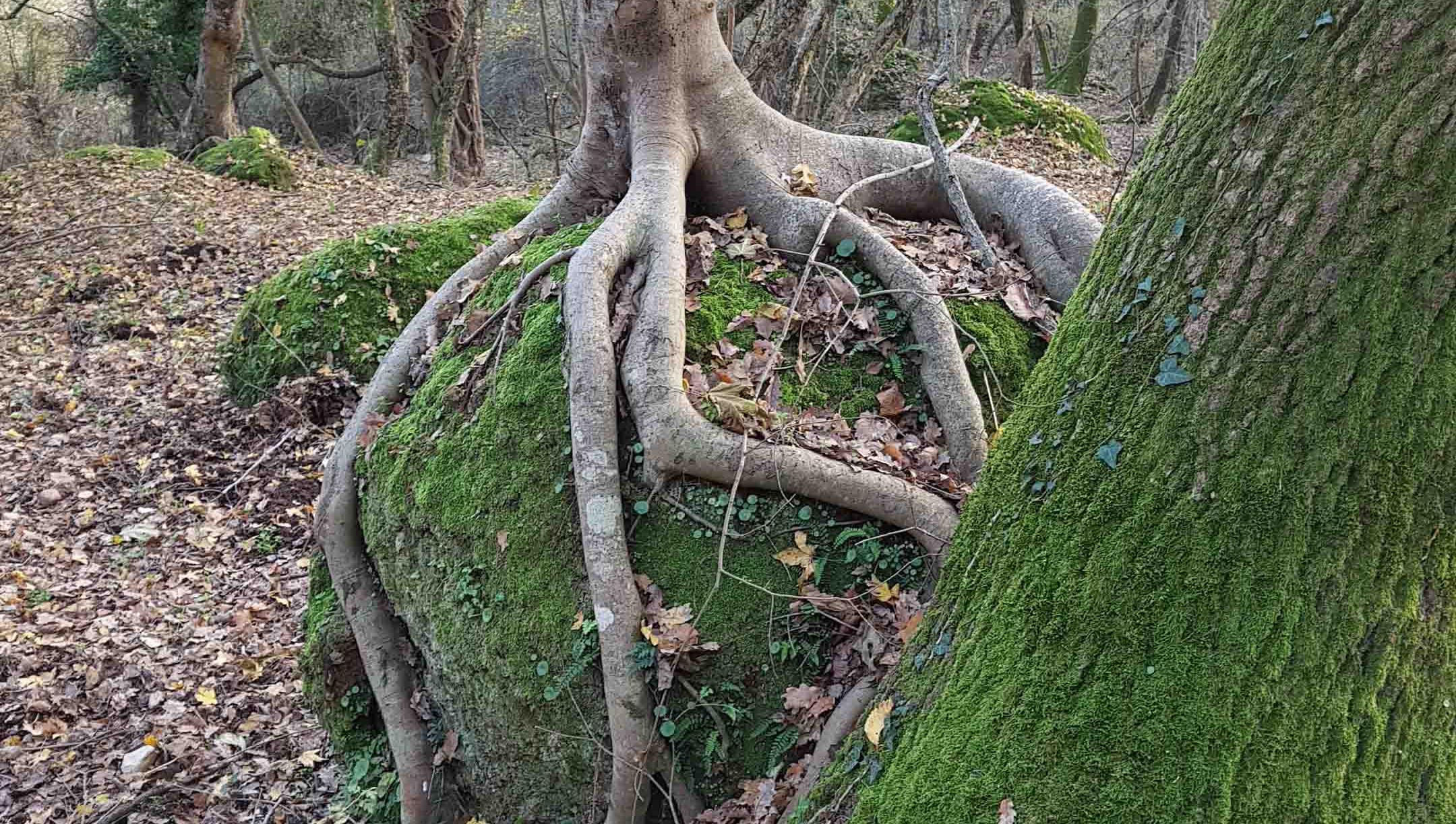 Un albero cresciuto sopra un masso, ormai completamente inglobato nelle sue radici.