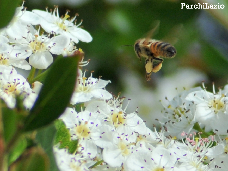 Un'ape si allontana con le sacche piene di polline. Le api che vanno alla ricerca di cibo sono le "bottinatrici". L’importanza dell’impollinazione è incommensurabile per l’ecosistema: senza api moltissime piante non si riprodurrebbero.