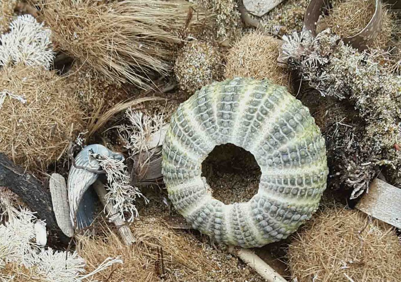 Il riccio di mare, un echinoderma, quando perde gli aculei mostra la tipiche striature sull'esoscheletro. La simmetria è pentaraggiata come un altro echinoderma: la stella marina. Foto di Patrizio Demartis