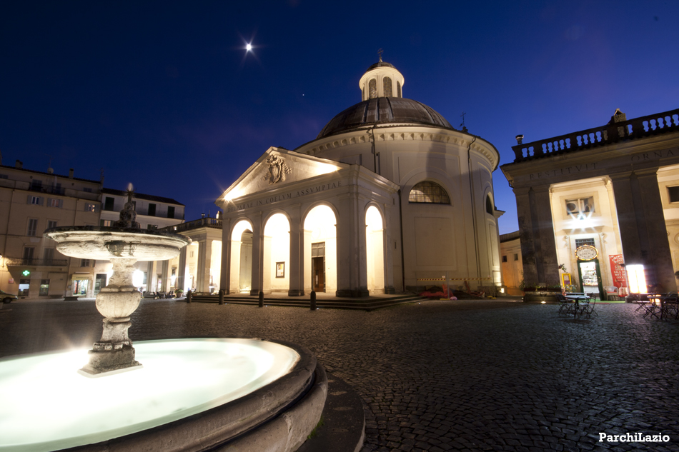 Una notte lucente, con i riflessi dell'acqua e le arcate della chiesa berniniana. Ariccia, con i Chigi, nel XVII secolo divenne un importante centro di potere e un punto focale per i viaggiatori del Grand Tour.