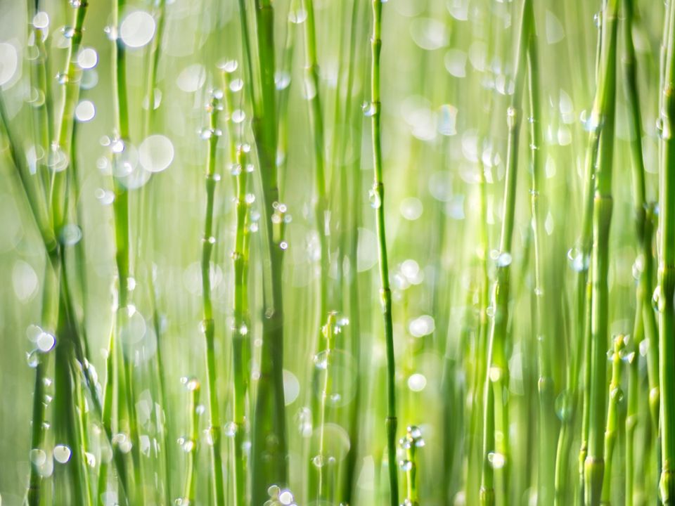 La rugiada posata sulla vegetazione ripariale del lago di Bolsena risplende al primo sole mattutino.
