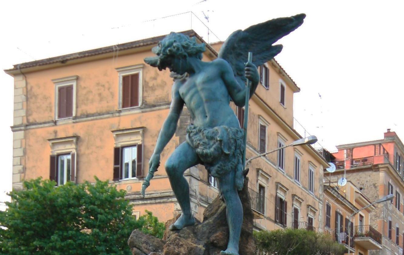 All’entrata di Monte Compatri, al centro della piazza, c’è la fontana dell'Angelo. È sormontata da una scultura che ha le sembianze di un Angelo, o Genio alato, che ha in mano un piccone ed è rappresentato nell’atto di dare fuoco ad una miccia. Piccone e miccia (per gli esplosivi) simboleggiano il lavoro degli uomini, che scavarono la roccia. Il monumento, inaugurato nel 1889, commemora infatti la realizzazione dell’acquedotto che portò nel centro abitato l'acqua proveniente dall'altipiano della Doganella, a diversi chilometri di distanza.