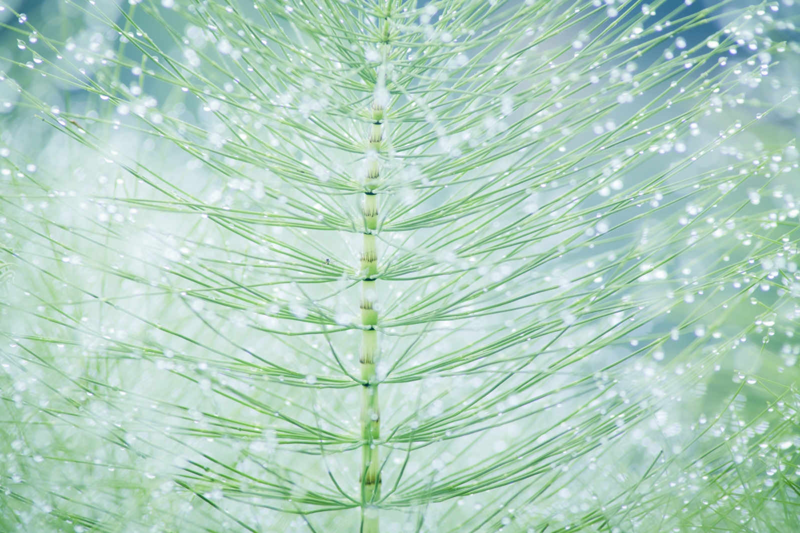 Equiseto ricoperto dalla rugiada mattutina. Queste piante singolari, conosciute comunemente con il nome di code di cavallo, sono degli autentici “fossili viventi” e vegetano esclusivamente in aree ad elevata umidità.