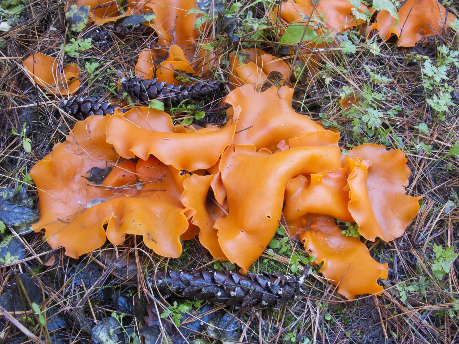 Una Aleuria aurantia, singolare fungo colorato in arancione, all’interno di una pineta sui colli Cimini (Viterbo).