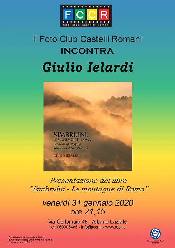 Venerdi 31 gennaio alle ore 21,15 presso la sede del Foto Club Castelli Romani in via Cellomaio 48 Albano Laziale si terrà la presentazione del libro "Simbruini - Le Montagne di Roma - Diario di un fotografo alla ricerca della wilderness" con l'autore Giulio Ielardi.
