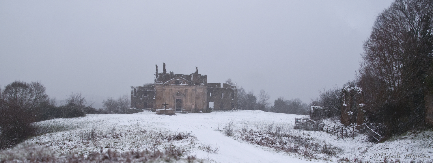 Una insolita vista delle rovine della Chiesa di San Bonaventura, progettata da Gian Lorenzo Bernini, durante una fitta nevicata invernale all'interno della città abbandonata di Monterano Vecchia (foto di repertorio).