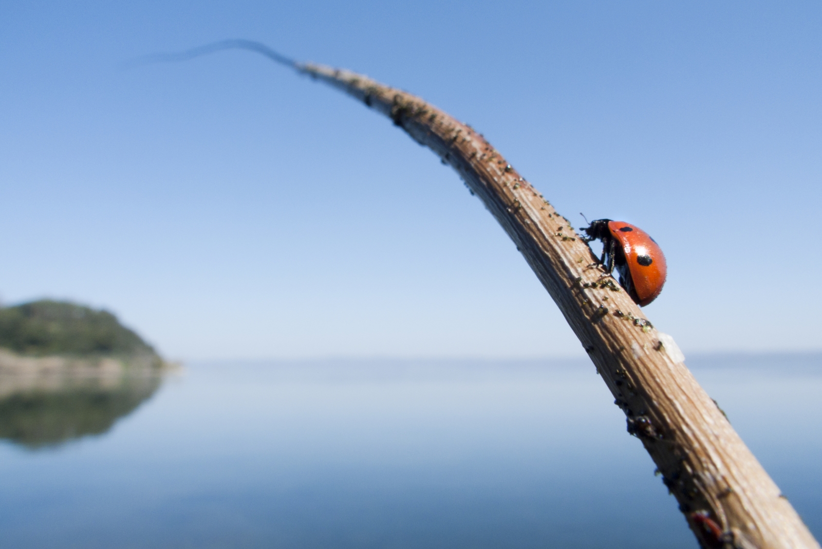 Il lungo viaggio: una coccinella sullo stelo di una pianta sulle rive del lago di Bolsena. Sullo sfondo si intravede l’isola Martana.