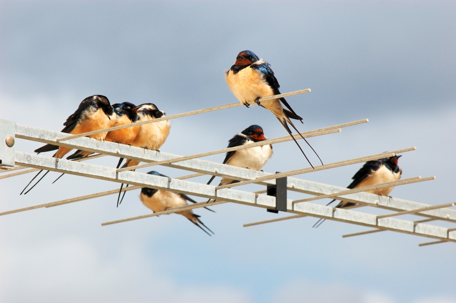 Dopo un lungo viaggio, le rondini si riposano su un’antenna televisiva.