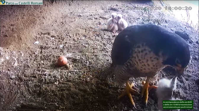 Una scena toccante e delicata. La femmina, dopo cinque giorni, porta via dal nido il corpicino del piccolo morto lo scorso 15 aprile. Nella cavità è ancora presente l'uovo, lesionato e certamente ormai infecondo, che però suscita ancora un qualche interesse tra gli adulti. Il tutto mentre i due giovani pulli godono buona salute.