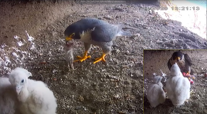 Tutto procede bene nel nido dei falchi, l'immagine è di ieri 27 aprile dove vediamo il maschio, identificato come "M", portare ai pulli un topo del genere Apodemus. L'occasionale predazione di roditori in questa specie è documentata soprattutto nelle coppie del nord Europa, ma per la nostra coppia è un dato del tutto nuovo.Nel riquadro, insieme alla femmina "F" che in seguito ha portato un grosso colombaccio, notiamo la differenza di dimensioni tra i due pulli, sicuramente determinata dal sesso (il più grande tra i due è femmina). Nel momento in cui scriviamo, oggi 28 aprile alle 10:00, i genitori hanno già portato al nido ben 7 prede, in meno di 4 ore.