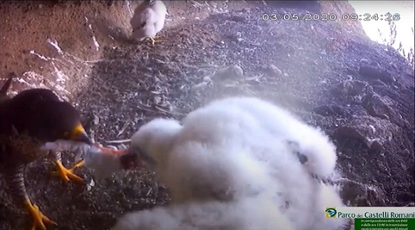 I due falchetti stanno crescendo bene. Dal candido piumino bianco spuntano, sulla punta della coda e sull'estremità delle ali, le penne più scure che ben presto completeranno il passaggio da pulli a giovani falchi consentendo loro di poter iniziare l'allenamento al volo e dunque l'abbandono del nido. I giovani resteranno per tutta l'estate con i genitori, che insegneranno loro l'arte della caccia, continuando ad assisterli. Tra settembre e ottobre, sollecitati dagli adulti, lasceranno il sito di nidificazione diventando “erranti”, per colonizzare altre aree, fino a quando non troveranno un sito adatto e un compagno. Nel frattempo cercheranno un luogo che possa offrire loro cibo e riparo.