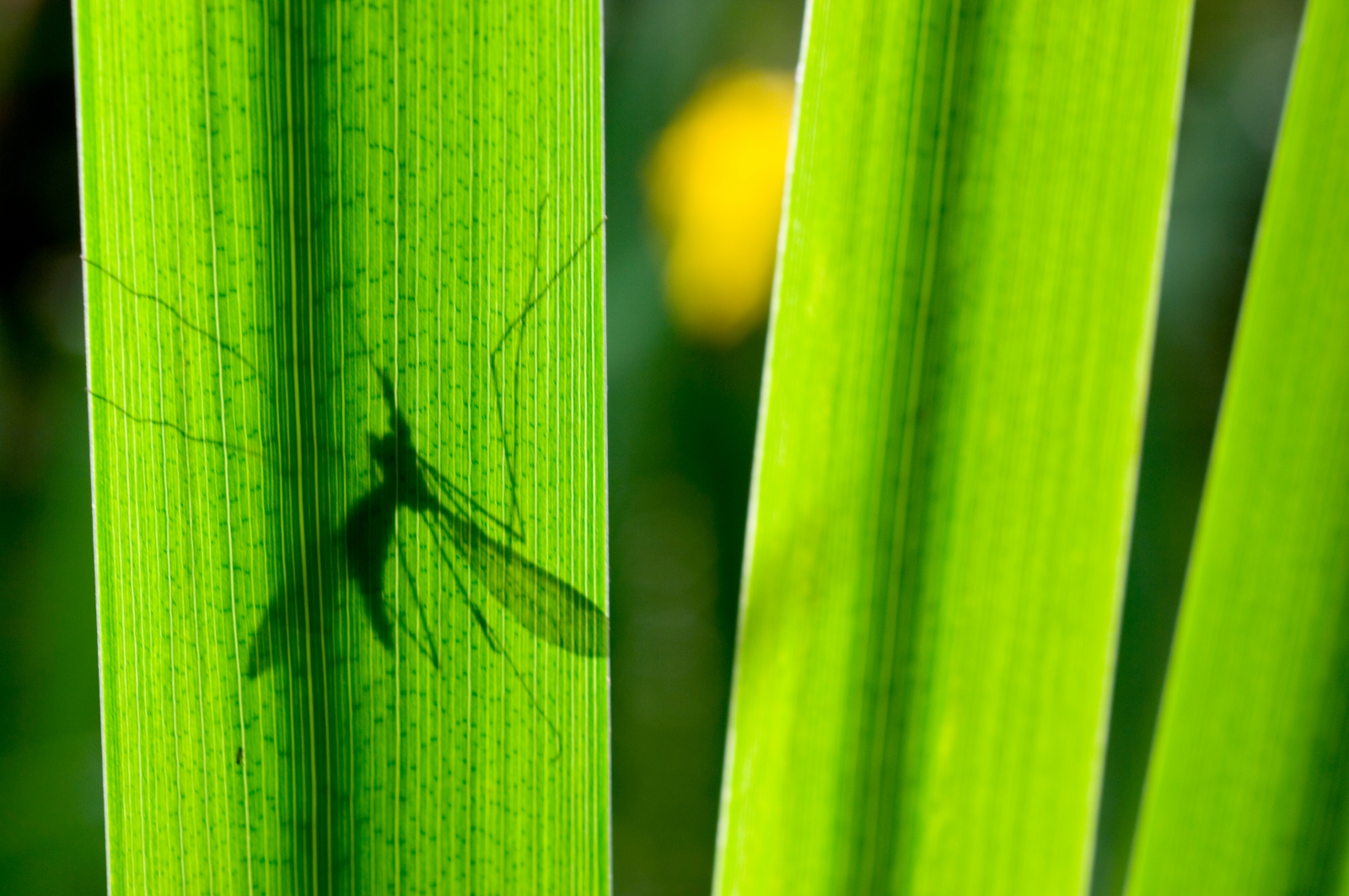 Una tipula nascosta dietro le foglie di un Iris giallo rivela la sua presenza grazie al sole di primavera.