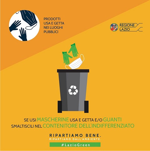 La Regione Lazio lancia la campagna di comunicazione e sensibilizzazione “Ripartiamo bene. Ripartiamo dall’ambiente”, sulla corretta gestione dei rifiuti legati all’emergenza Covid-19.