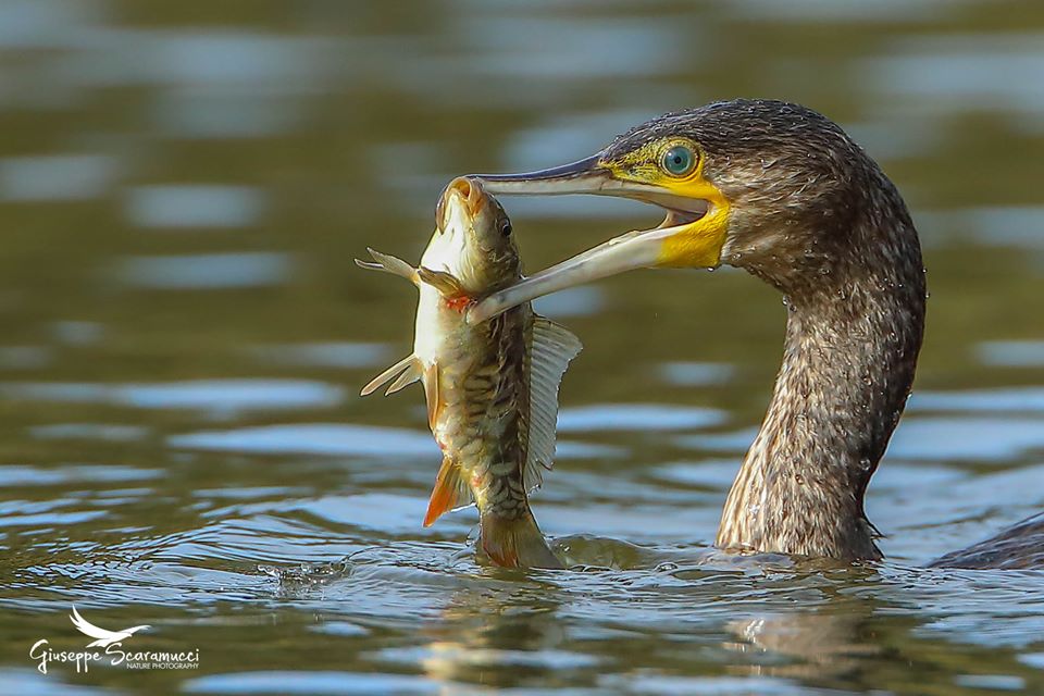 Cormorano (Phalacrocorax carbo) con una bella carpa a specchio per pranzo.