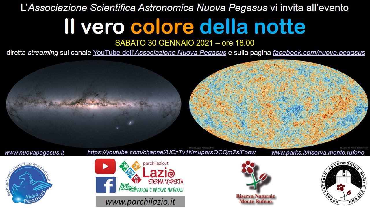 Sabato 30 gennaio 2021 l’Associazione Scientifica Astronomica Nuova Pegasus di Orvieto (TR) organizza un evento pubblico online dal titolo “Il vero colore della notte”, uno sguardo sulle caratteristiche fisiche del nostro universo.
