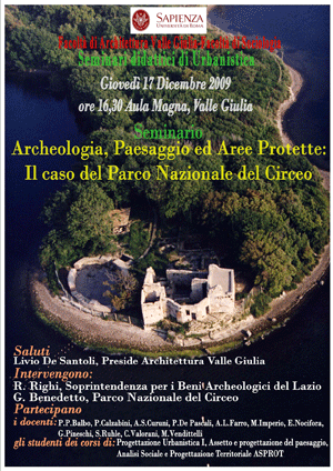 Giovedì 17 dicembre 2009 alle ore 16.30 presso l'Aula Magna della Facoltà di Architettura dell'Università "La Sapienza" di Roma (Valle Giulia) si terrà il seminario dal titolo "Archeologia, paesaggio e Aree Protette, il caso del Parco Nazionale del Circeo".