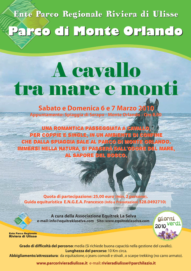 Una romantica passeggiata a cavallo, per coppie e single, in un ambiente di confine che dalla spiaggia sale al Parco di Monte Orlando. Immersi nella natura si passerà dall'odore del mare al sapore del bosco.
