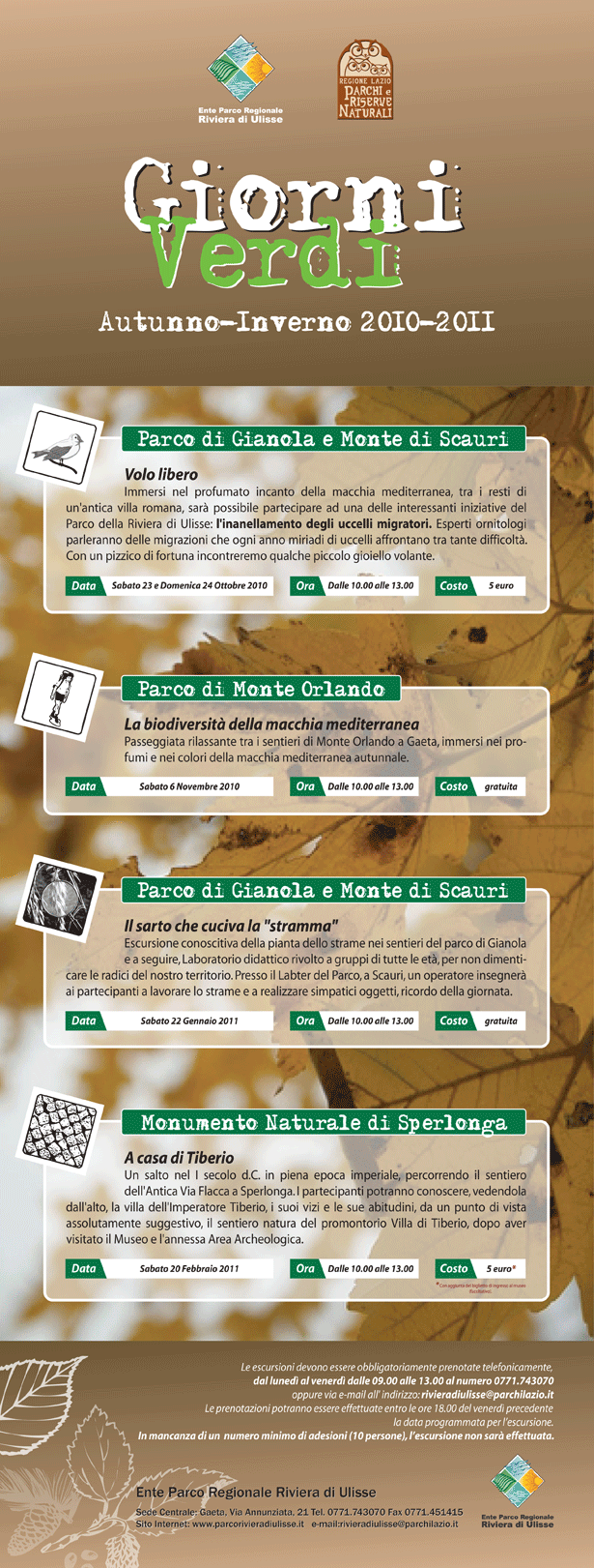 Si ricorda che per partecipare alle escursioni è necessario prenotare in anticipo telefonando al n. 0771.743070 oppure via e-mail all'indirizzo rivieradiulisse@parchilazio.it