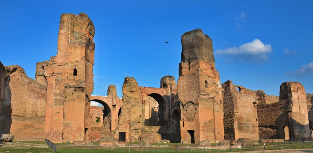 Le Thermae Antonianae, uno dei più grandi e meglio conservati complessi termali dell'antichità, furono costruite nella parte meridionale della città per iniziativa di Caracalla, che dedicò l'edificio centrale nel 216 d.C. La pianta rettangolare è tipica delle "grandi terme imperiali". Le terme non erano solo un edificio per il bagno, lo sport e la cura del corpo, ma anche un luogo per il passeggio e lo studio. Si entrava nel corpo centrale dell'edificio da quattro porte sulla facciata nord-orientale. Sull'asse centrale si possono osservare in sequenza il calidarium, il tepidarium, il frigidarium e le natatio; ai lati di questo asse sono disposti simmetricamente attorno alle due palestre altri ambienti. Le Terme di Caracalla sono uno dei rari casi in cui è possibile ricostruire, sia pure in parte, il programma decorativo originario. Le fonti scritte parlano di enormi colonne di marmo, pavimentazione in marmi colorati orientali, mosaici di pasta vitrea e marmi alle pareti, stucchi dipinti e centinaia di statue e gruppi colossali, sia nelle nicchie delle pareti degli ambienti, sia nelle sale più importanti e nei giardini. Per l'approvvigionamento idrico fu creato un ramo speciale dell'acquedotto dell'Acqua Marcia, l'Aqua Antoniniana. Restaurato più volte, l'impianto termale cessò di funzionare nel 537 d.C....