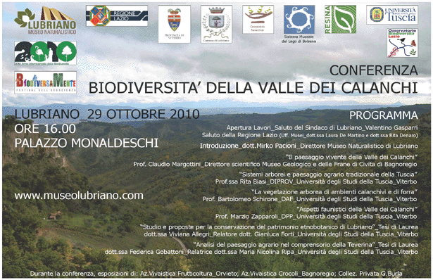 Venerdì 29 ottobre p.v. alle ore 16.00 presso il Palazzo Monaldeschi a Lubriano in Piazza S. Giobatta, 1 si terrà la Conferenza "Biodiversità della Valle dei Calanchi".