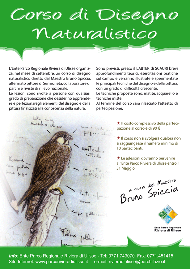 L'Ente Parco Regionale Riviera di Ulisse organizza nel mese di Settembre, presso il LABTER di Scauri, un corso di disegno naturalistico diretto dal maestro Bruno Spiccia, affermato pittore e collaboratore di parchi e riviste di rilievo nazionale.