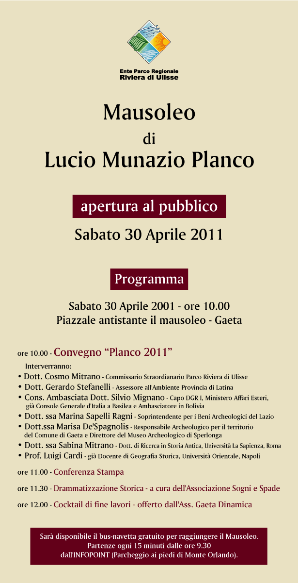 Sabato 30 Aprile 2011, nel Parco Regionale di Monte Orlando, ci sarà l'apertura al pubblico del Mausoleo di Lucio Munazio Planco.